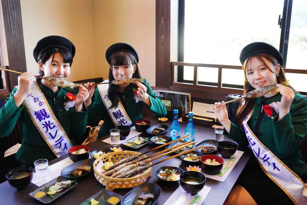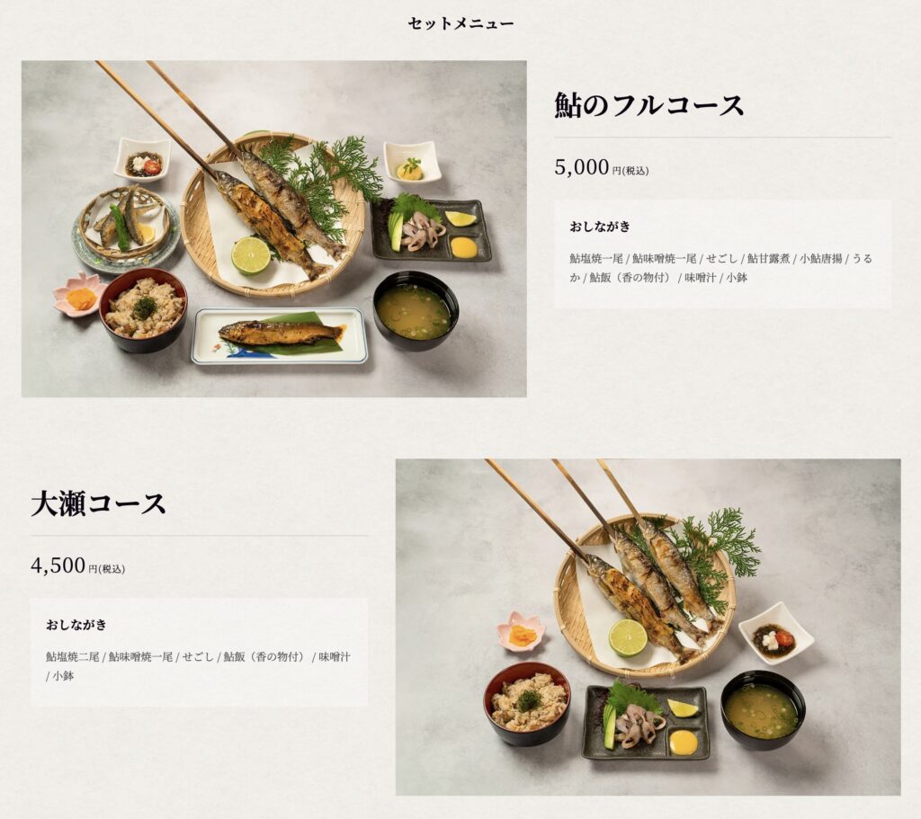 ・鮎のフルコース (鮎塩焼一尾 / 鮎味噌焼一尾 / せごし / 鮎甘露煮 / 小鮎唐揚 / うるか / 鮎飯(香の物付) / 味噌汁 / 小鉢)、2時間飲み放題。
