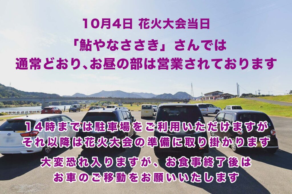 ただし14時を過ぎますと、駐車場では花火大会の準備が始まりますので、食事棟をご利用の方は大変恐れ入りますが、お食事終了後はお車のご移動をお願いいたします。